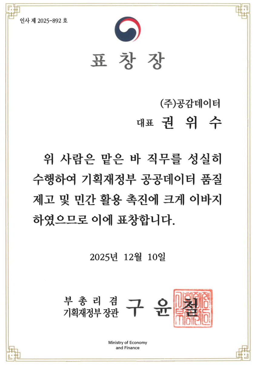 2025년 기획재정부 공공데이터 부문 유공 표창