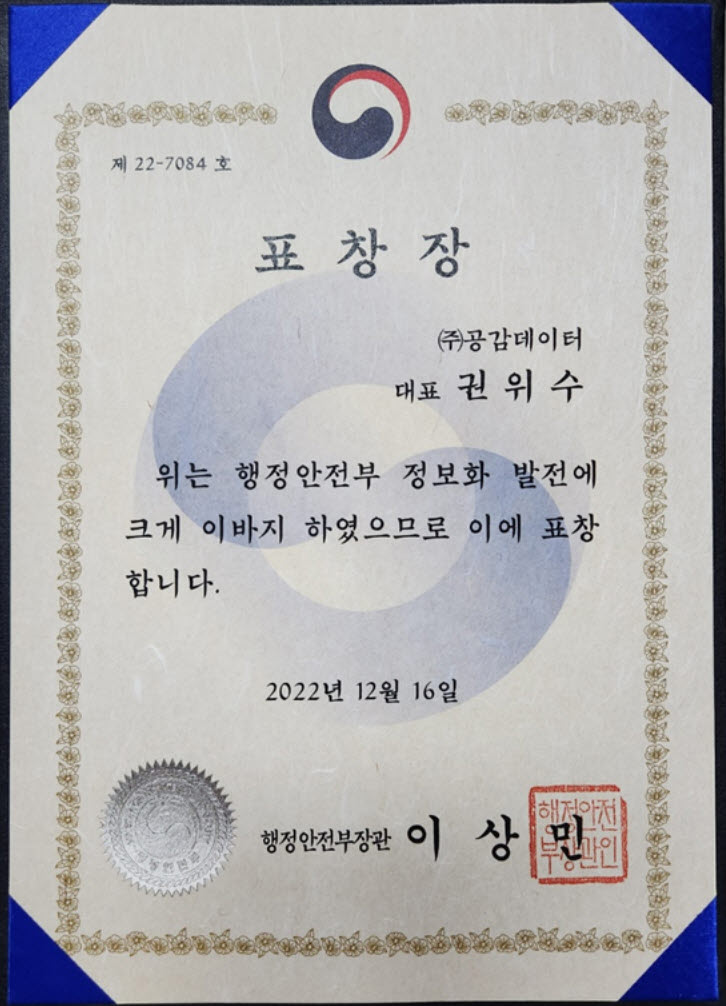 2022년 행정안전부 정보화 유공(데이터 분야) 표창